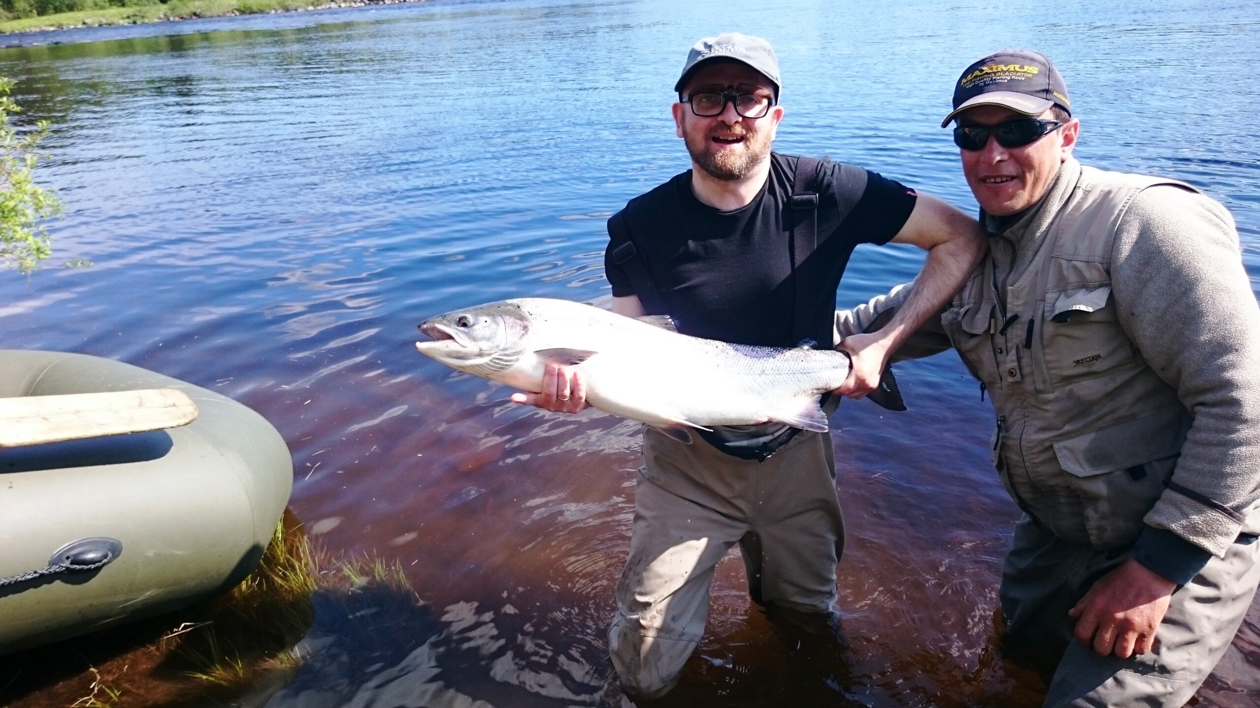 Ég fann strax að hann var stór, en þeir eru allir stórir í júni í Kola. Spurningin var bara hvort þetta væri nýi metfiskurinn minn. Ég var svo stressaður að ég gerði fáránleg byrjendamistök og var nokkuð glaður að það sá enginn þær aðfarir, það söng í hjólinu og gædinn kallaði á mig skipanir en ég náði að gera allt öfugt við það sem ég átti að gera. Að lokum tókst mér þó að landa og reyndist hann 92 cm, áætlaður 17 pund. Ekki alveg met, en nálægt því og ég var eitt bros – fyrsti Rússalaxinn minn á fyrsta degi. Þess má geta að aðeins önnur viðmið gilda um lengd og þyngd í Rússlandi en á Íslandi og er fiskurinn töluvert sverari í rússnesku ánum og því þyngri samkvæmt kvarðanum.